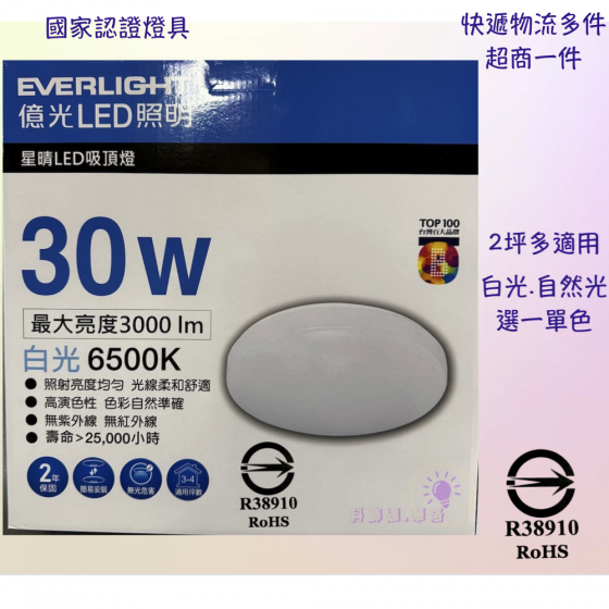 2坪~3坪適用~白光/黃光~單色簡單不用切換~陽台~採光罩~儲藏室~和室~30W億光吸頂燈~認證燈具