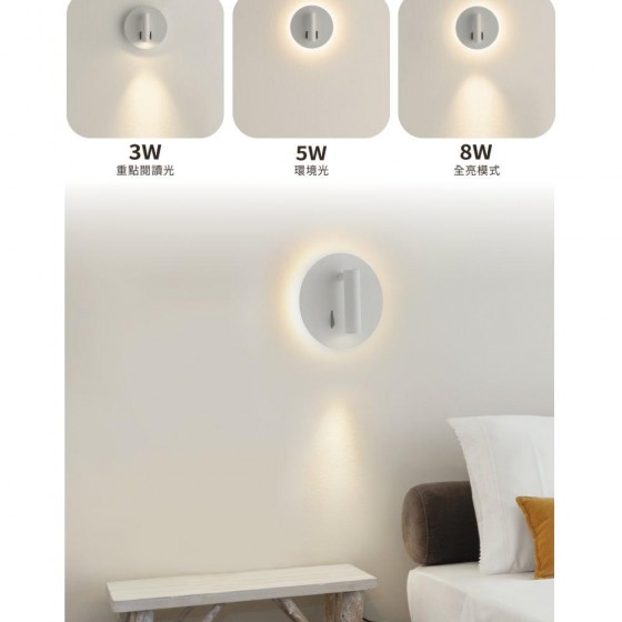 同時擁有光束與背光環 集重點照明和氣氛照明於一身 一指操控雙開關,切換自如 燈頭可調整角度,靈活自在 ✦ 三種燈光模式、可調式燈頭 ✦ 燈體自帶雙開關 ✦ 適用直式預埋盒 型號:LED-26011 電壓:100-240V 驅動器:內置型 消耗電力:8W 色溫:黃光3000K 光通量:487 lm 演色性:80 平均壽命:15000小時 材質:鋁合金烤漆 尺寸:長155mm*深110mm 適用:適用直式預埋盒