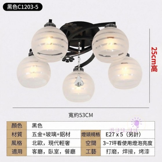 半吸頂燈.黑體5燈-鋁花瓣半吸頂燈C1203-5